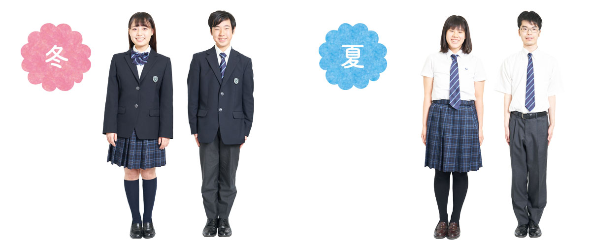 みのり高等部の制服は男女ともに、ホワイトとネイビーを基調にしたデザインです。ジャケットは男女ともに品性や洗練、規範性の象徴であるネイビーを採択。胸ポケット部分にはみのり高等部エンブレム、ボタンもジャケットの色合と同化するように細部までこだわりました。男子のスラックスはグレー、女子のブルーのチェック柄スカートは、ジャケットとのコントラストを生んでいます。