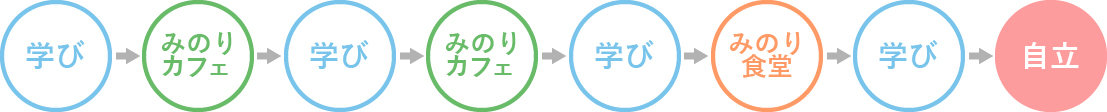 水耕栽培を利用し、自分たちで育てた食材を使ったメニューを 提供する「みのり食堂」を運営します。 疑似体験を通して無理なく楽しく学びます。お店のチラシ、看板 やメニュー表などの作成から、商品の仕入れや売り上げなどの 商業的な内容、お店での業務の役割分担、そして実際の接客な ど、あらゆることが学びの場となります。年間を通し運営していきますので、繰り返し学ぶことができるメリットもあります。反復は慣れを生み、慣れは自信に繋がります。活動を通して自己肯定感 を育てながら、生徒の自立を促します。人との繋がりを通し、コミュニケーションを高め、様々な経験を積んでもらいます。その他 にもお祭りや遠足などの行事も立案から実施まで、ポジティブにそして楽しく無理なく学んでいきます。