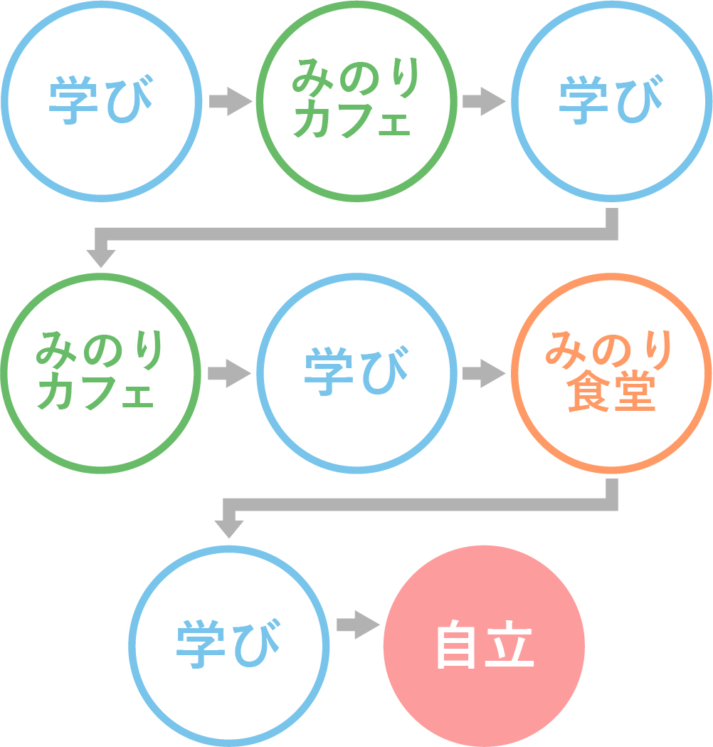 三宮校の学びは 、「リアルな疑似体験」を通して、様々なことに挑戦し個々のペースで学びを深めていきます。 その教育の柱が「みのり食堂」です。その準備のすべてを学びの場と位置づけ、無理なく少しずつできることを増やしていきます。